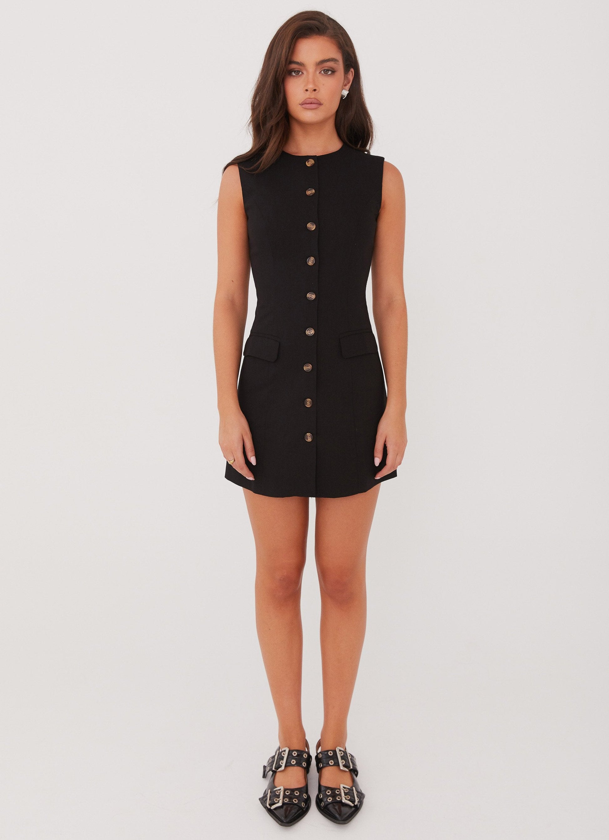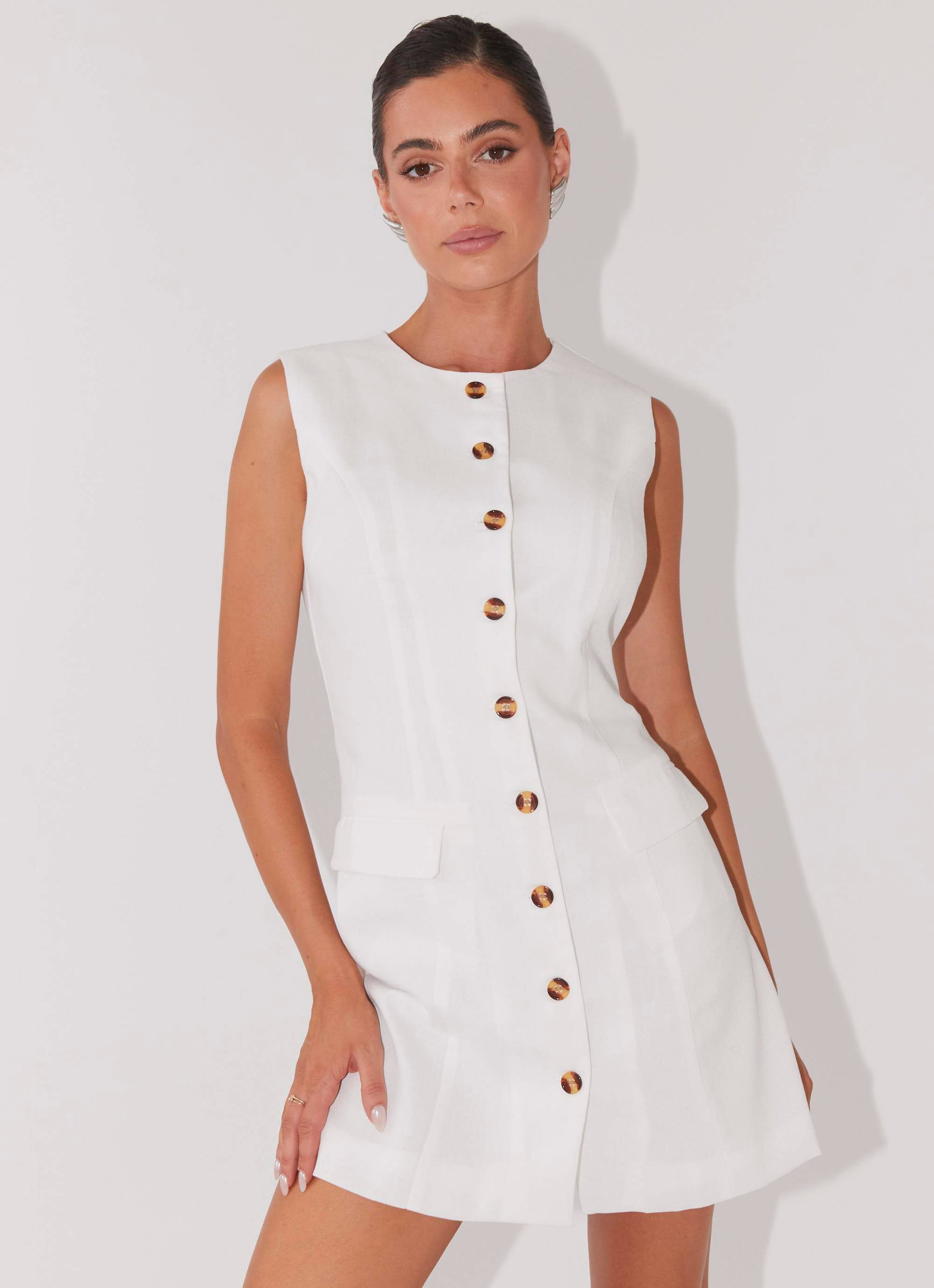 Tailored meets effortless in the Castello Linen Vest Dress—crafted from a breathable linen-cotton blend and finished with tortoise shell buttons, front pockets, and an adjustable back buckle. Now in radiant yellow, this structured mini is perfect for golden hour strolls, rooftop drinks, and warm summer nights.