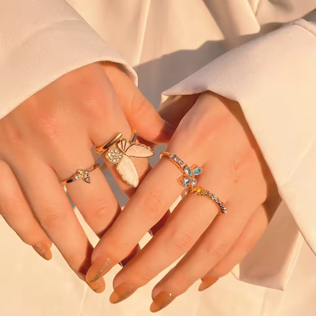 Whimsical yet refined, the Flutter Ring Set includes four golden rings adorned with crystal and butterfly accents. Each piece stands on its own, yet wears beautifully as a stack — playful but polished. Designed to elevate your everyday outfits or add a dreamy detail to your evening look. A Hazel exclusive for women who adore soft elegance with quiet impact.