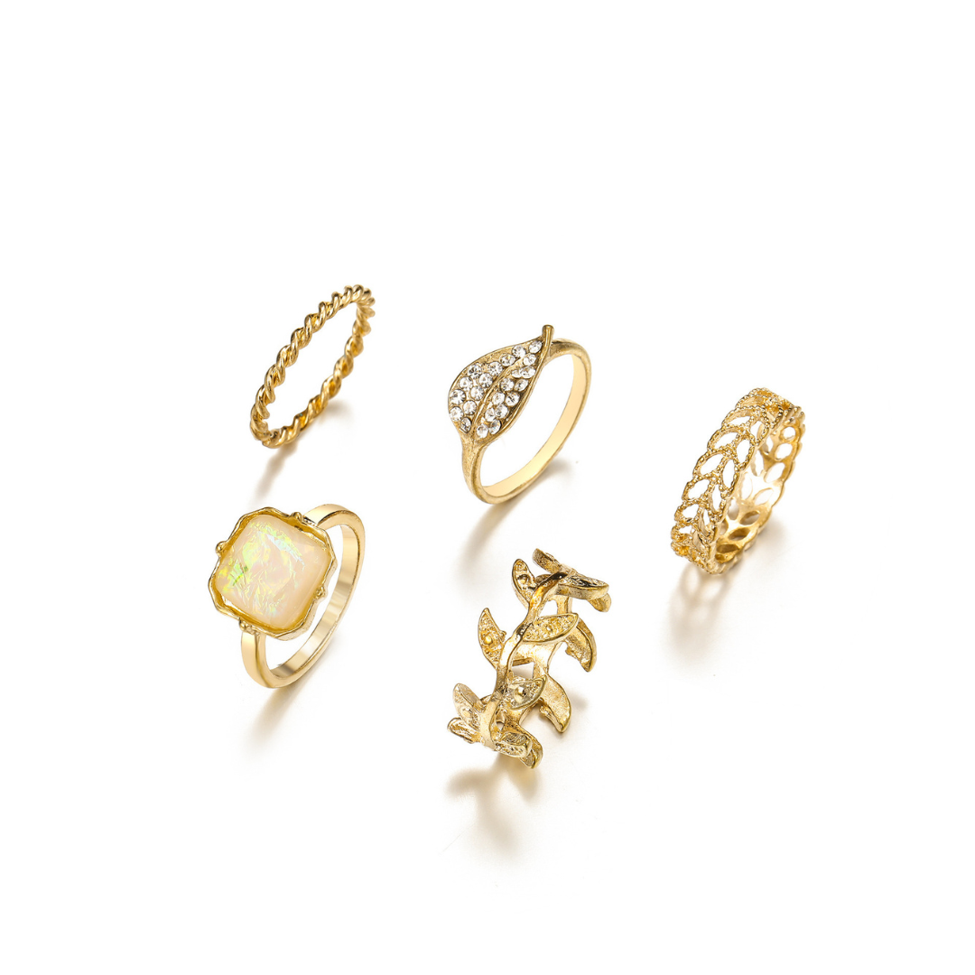 Minimal meets statement. The Golden Glow Ring Set features five unique gold-tone rings that complement each other effortlessly—designed to stack, gift, or wear solo for subtle flair. A signature piece from the Hazel line, this set is made for women who love delicate details with impact.