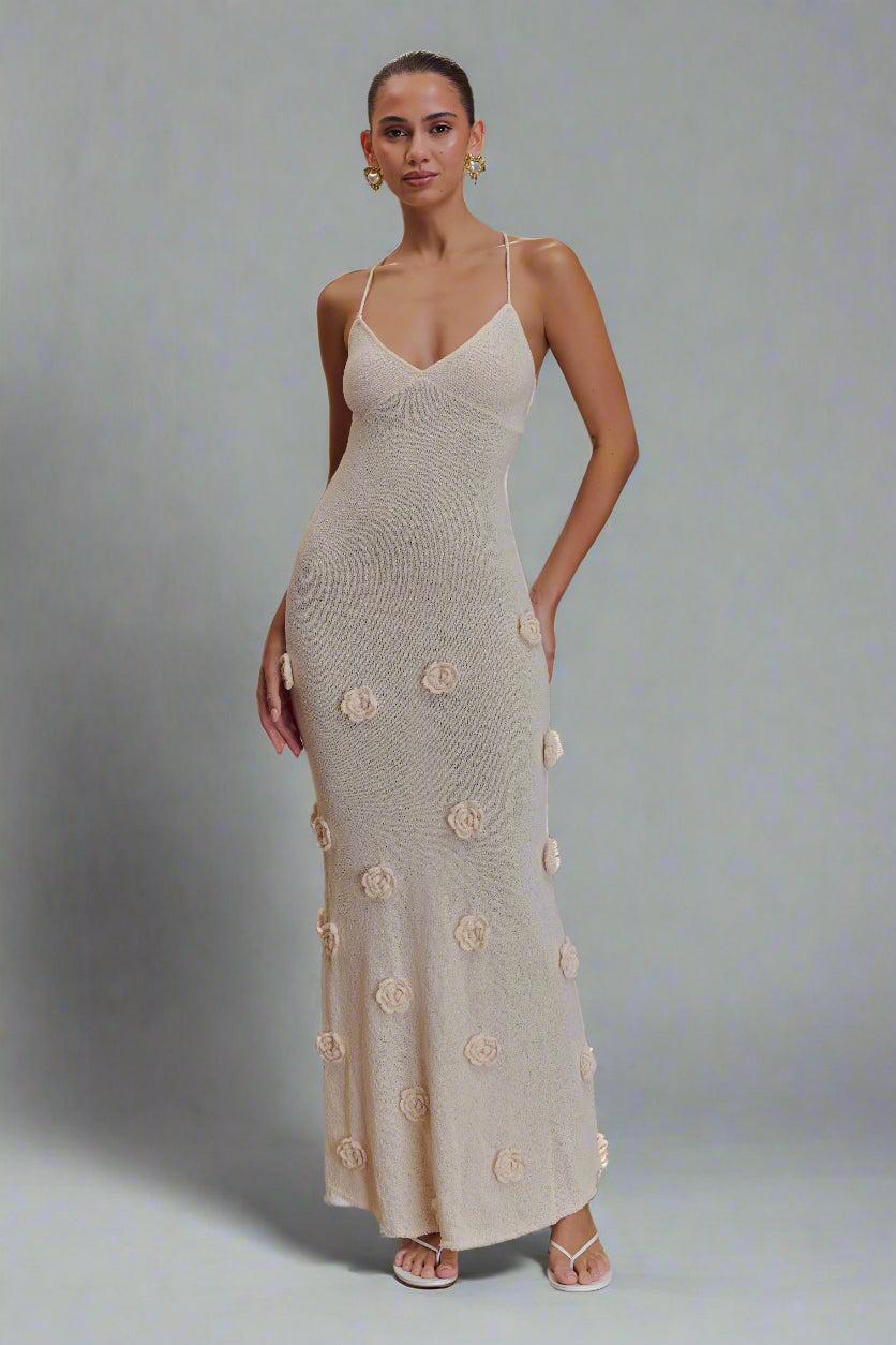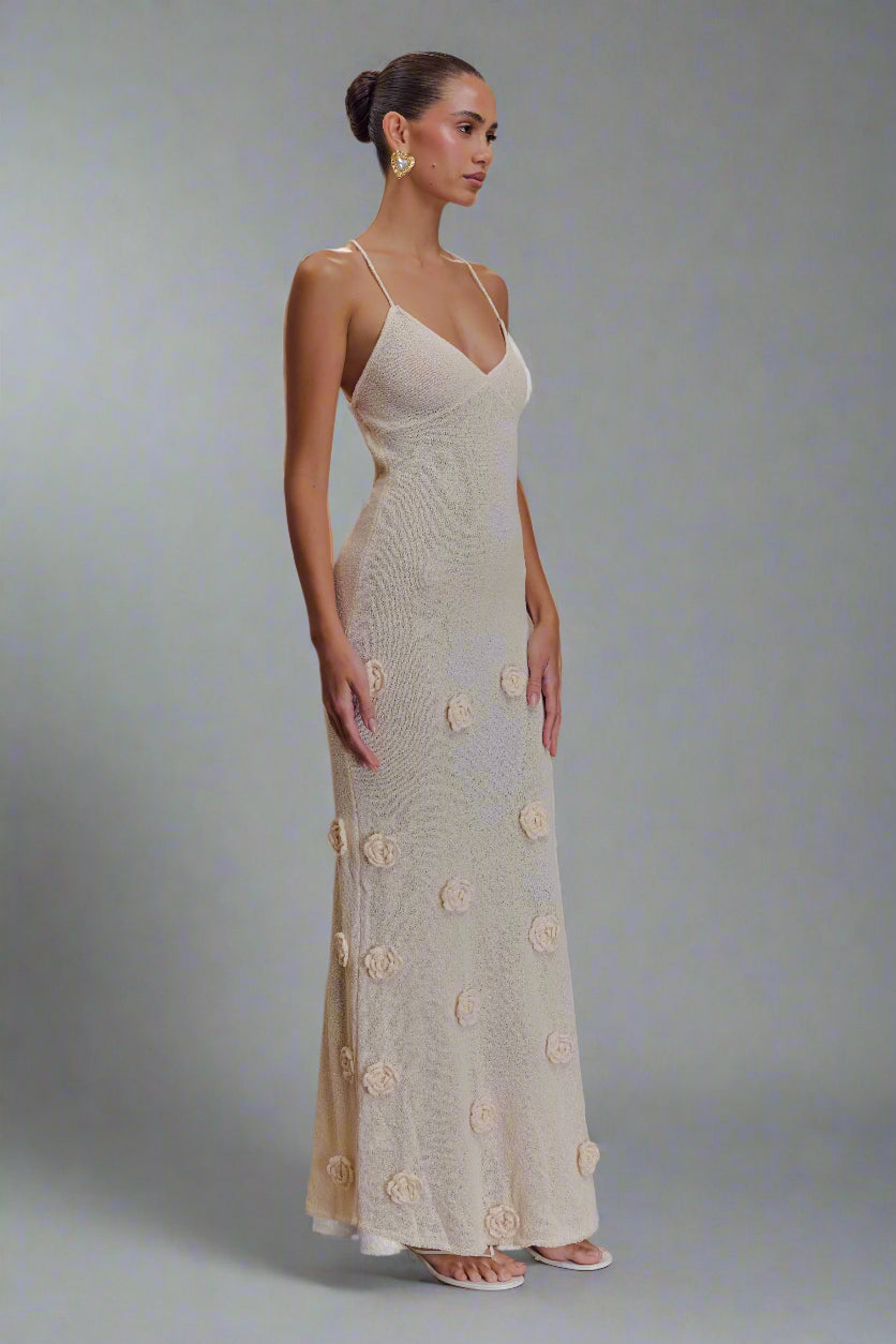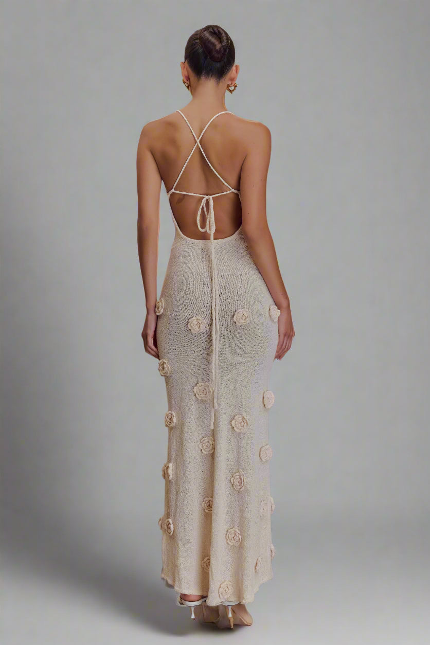 Romantic and bold, the Lily Crochet Maxi Dress features a flattering V neckline, crisscross straps, and a body-hugging fit. Finished with delicate flower appliqué, it’s the perfect choice for festivals, date nights, or summer soirées.