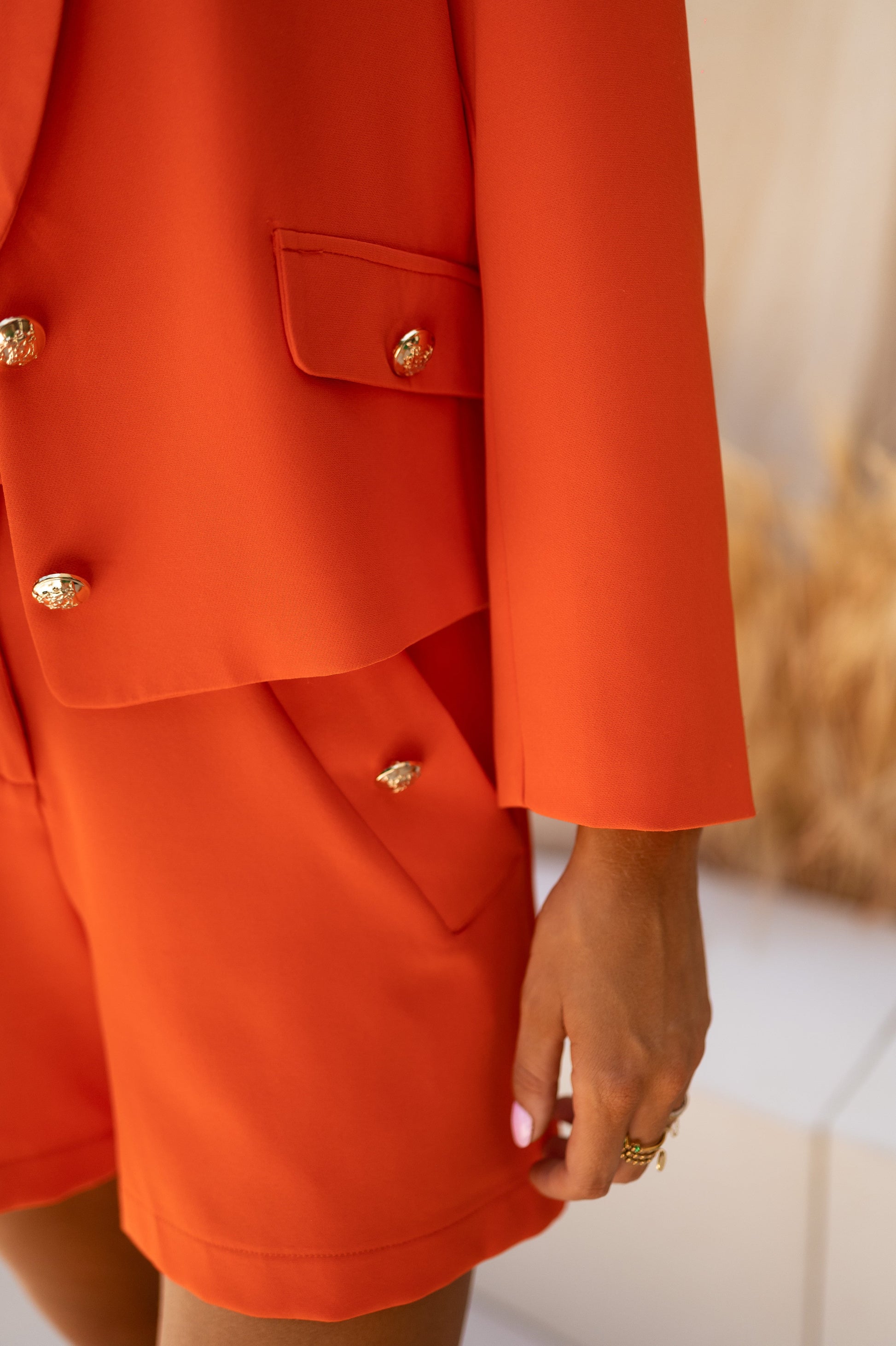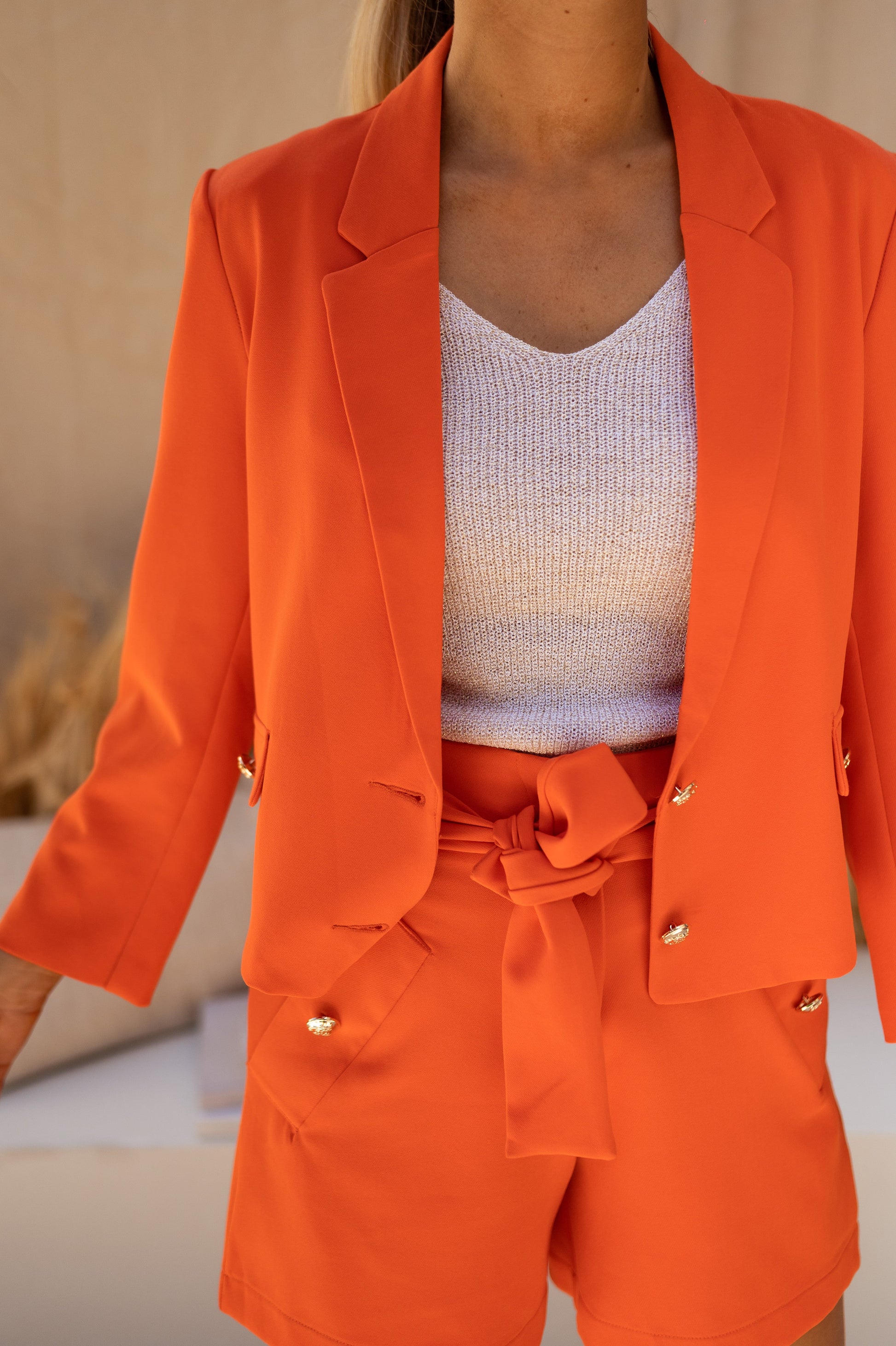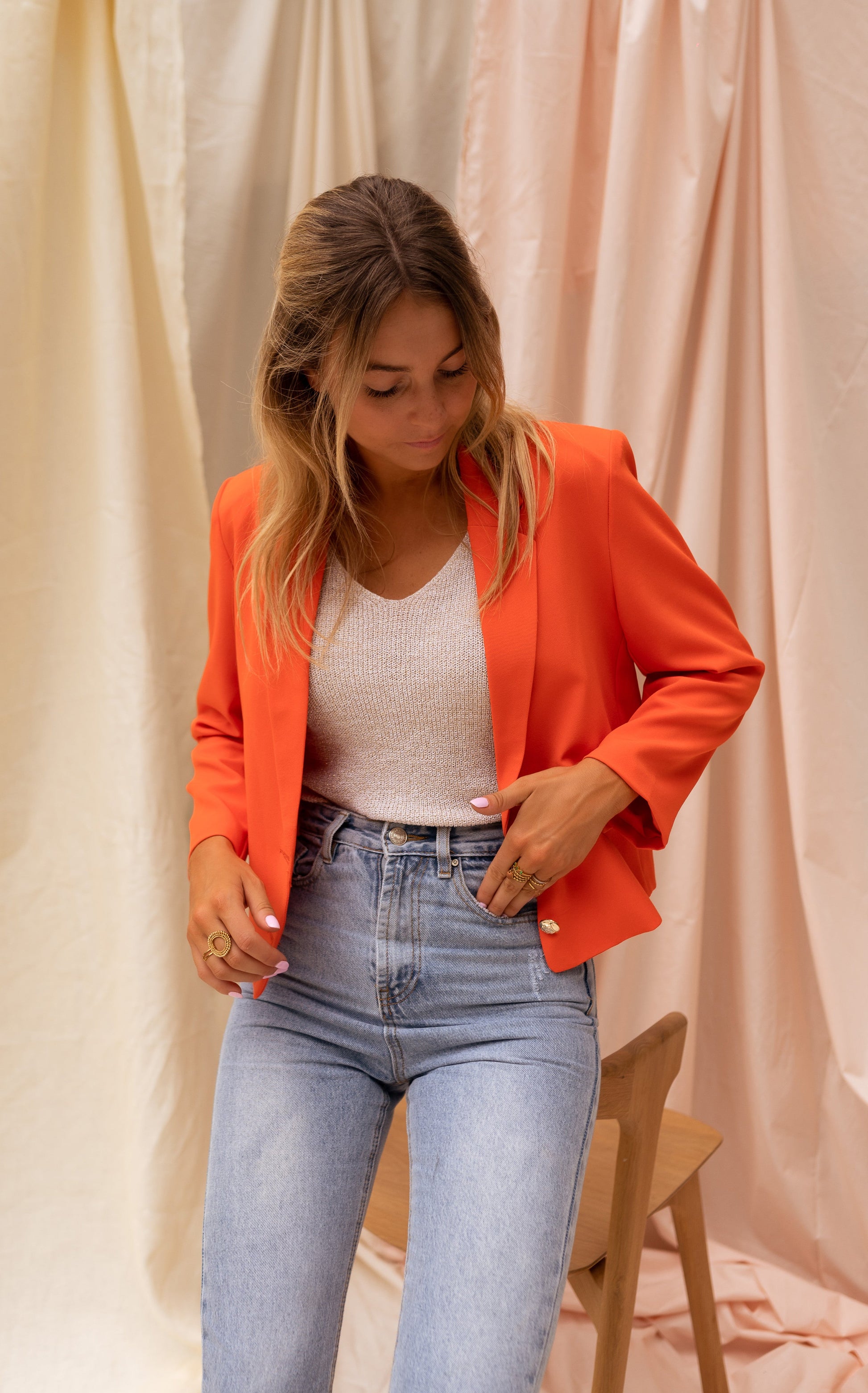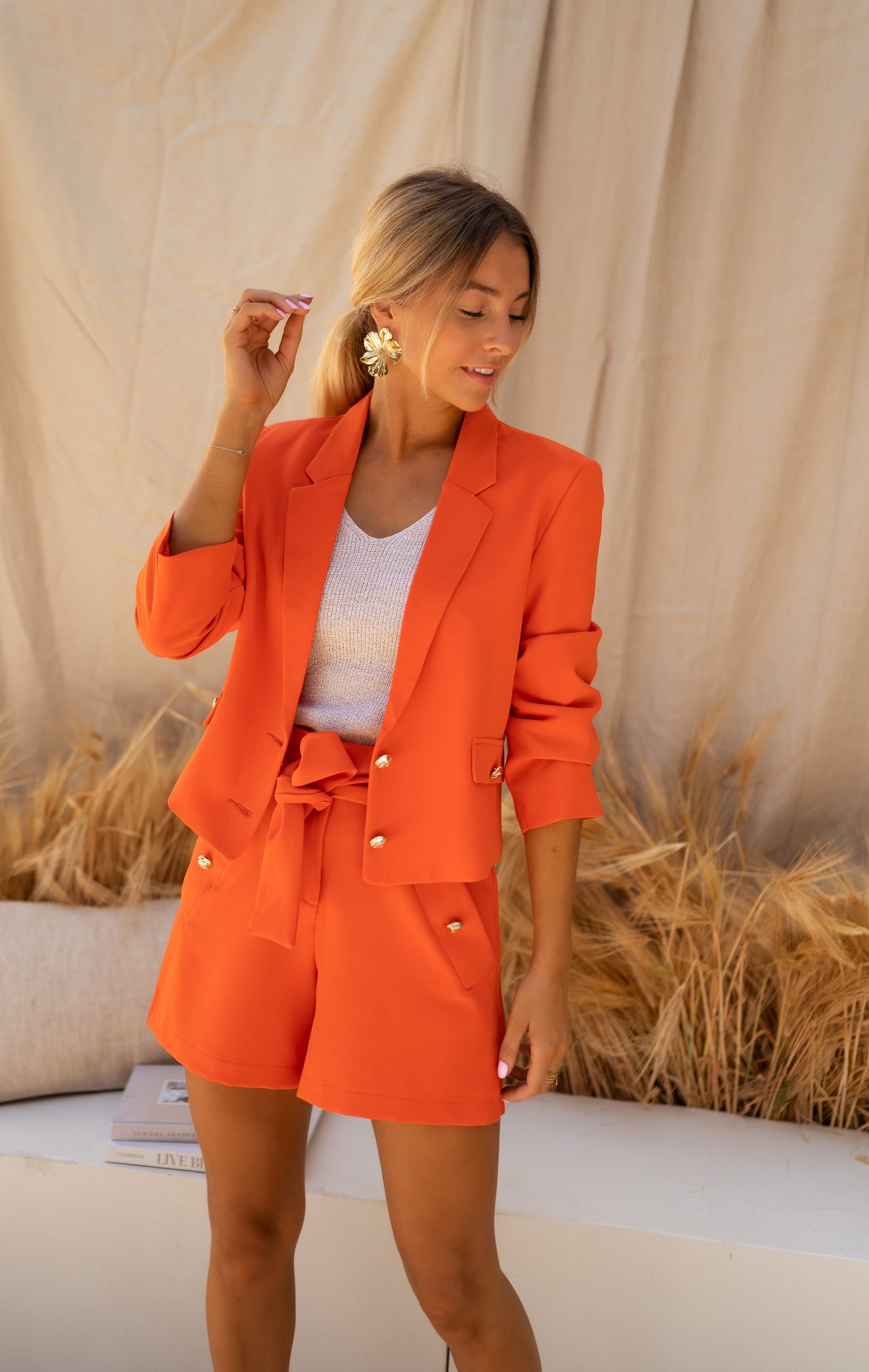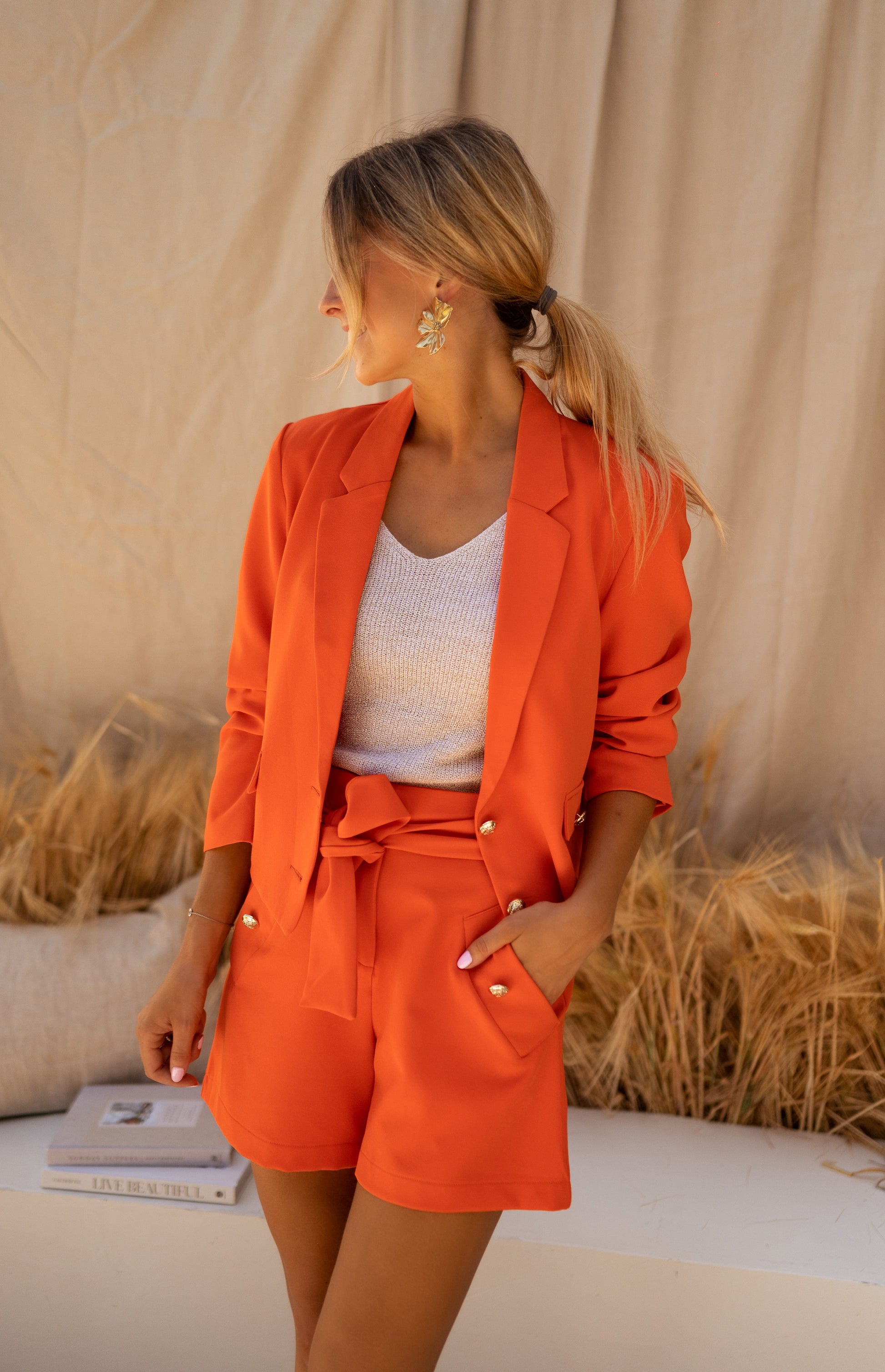 • Notre modèle porte le top Jarod doré à paillettes, le jeans Hunter bleu clair et le short Claro orange