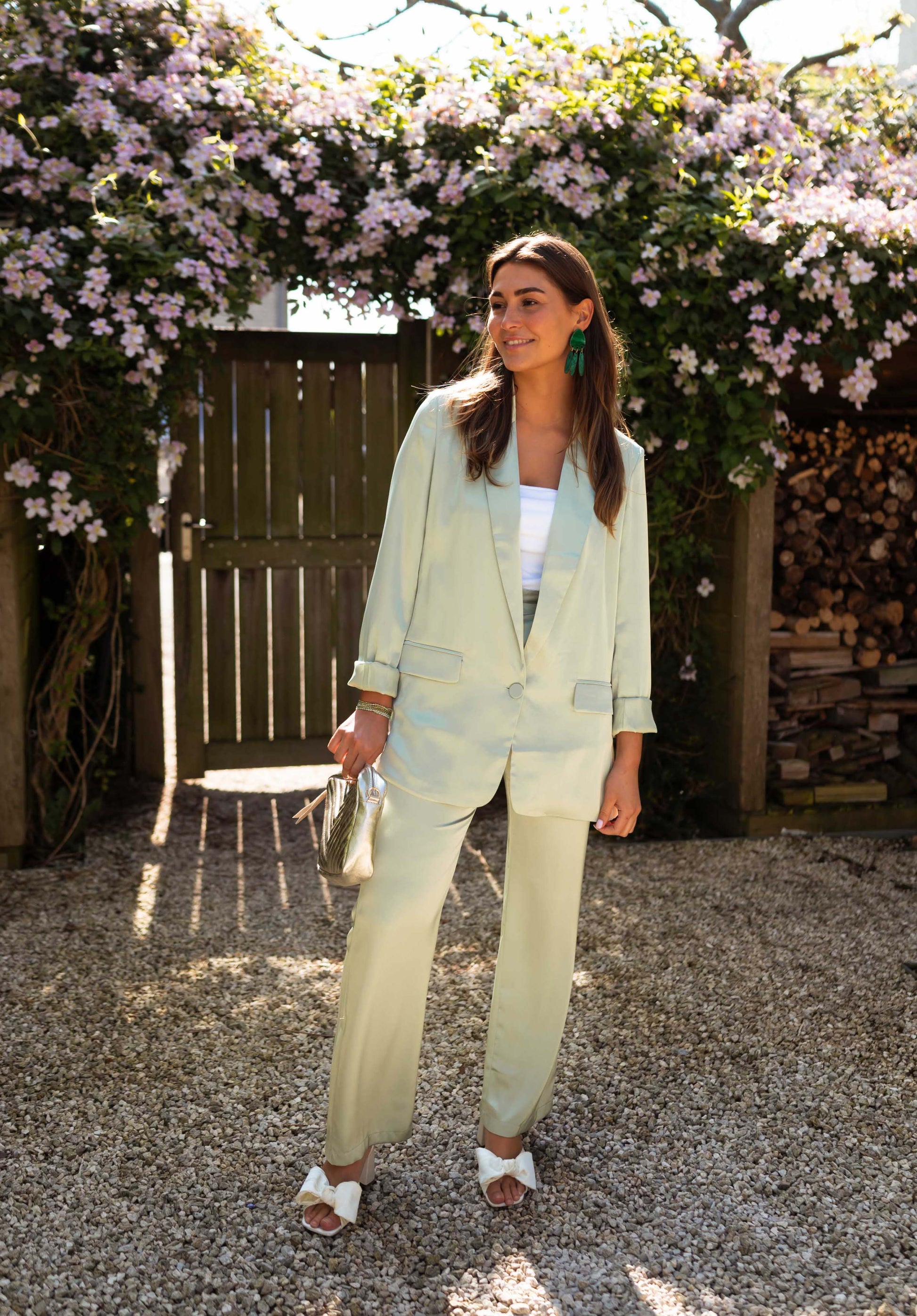 • Nos modèles portent le pantalon Appoline vert d'eau, le top Andrea et le sac Eric doré