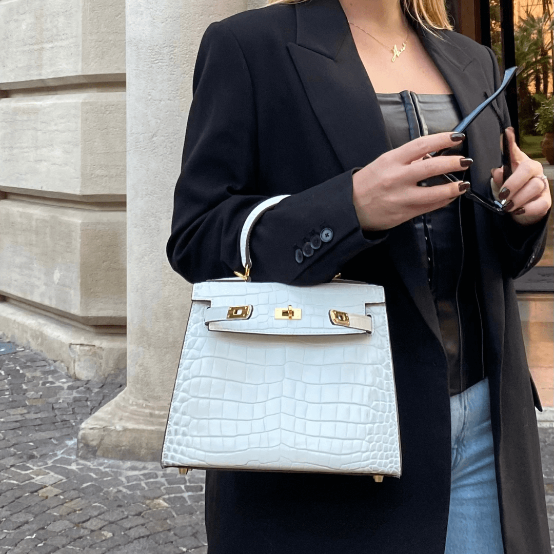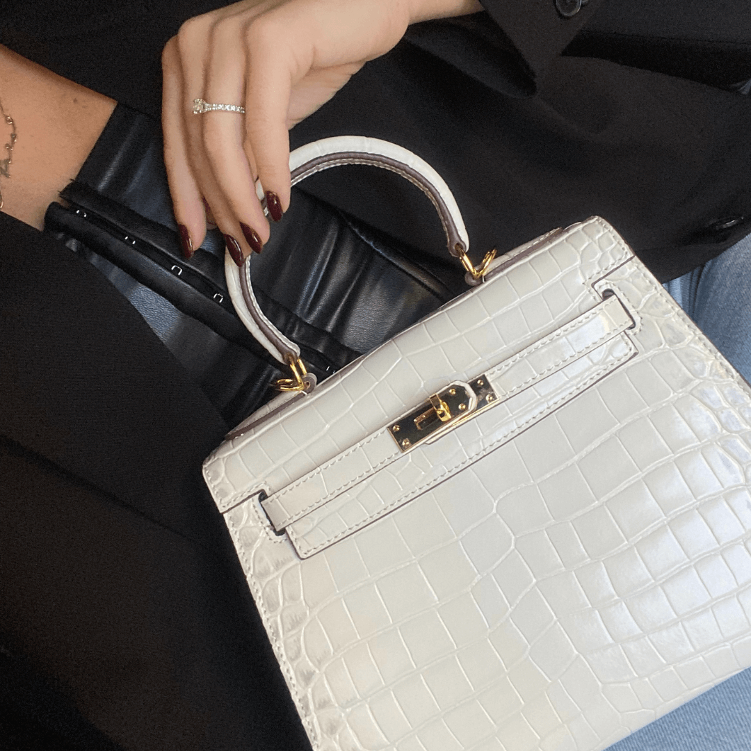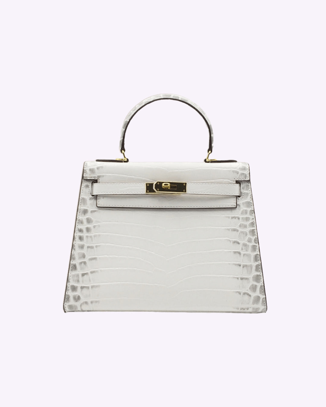 Un luxueux sac à main blanc en peau d'animal exotique pour la fashionista moderne. Ce sac élégant est fabriqué à partir des meilleurs matériaux et possède une poignée ronde pour un transport facile. L'audace de Georgia est compensée par la subtilité de sa texture éthérée, ce qui en fait l'accessoire parfait pour tout événement élégant.