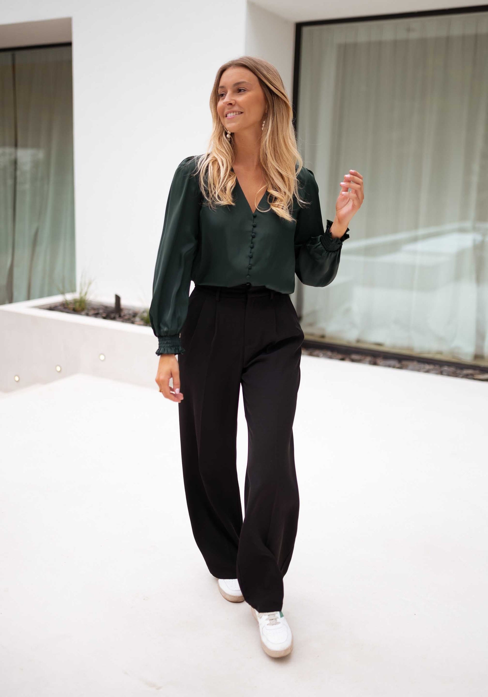 • Nos modèles portent la blouse Daina verte, le body Miora camel et le pull crop top Cruz beige