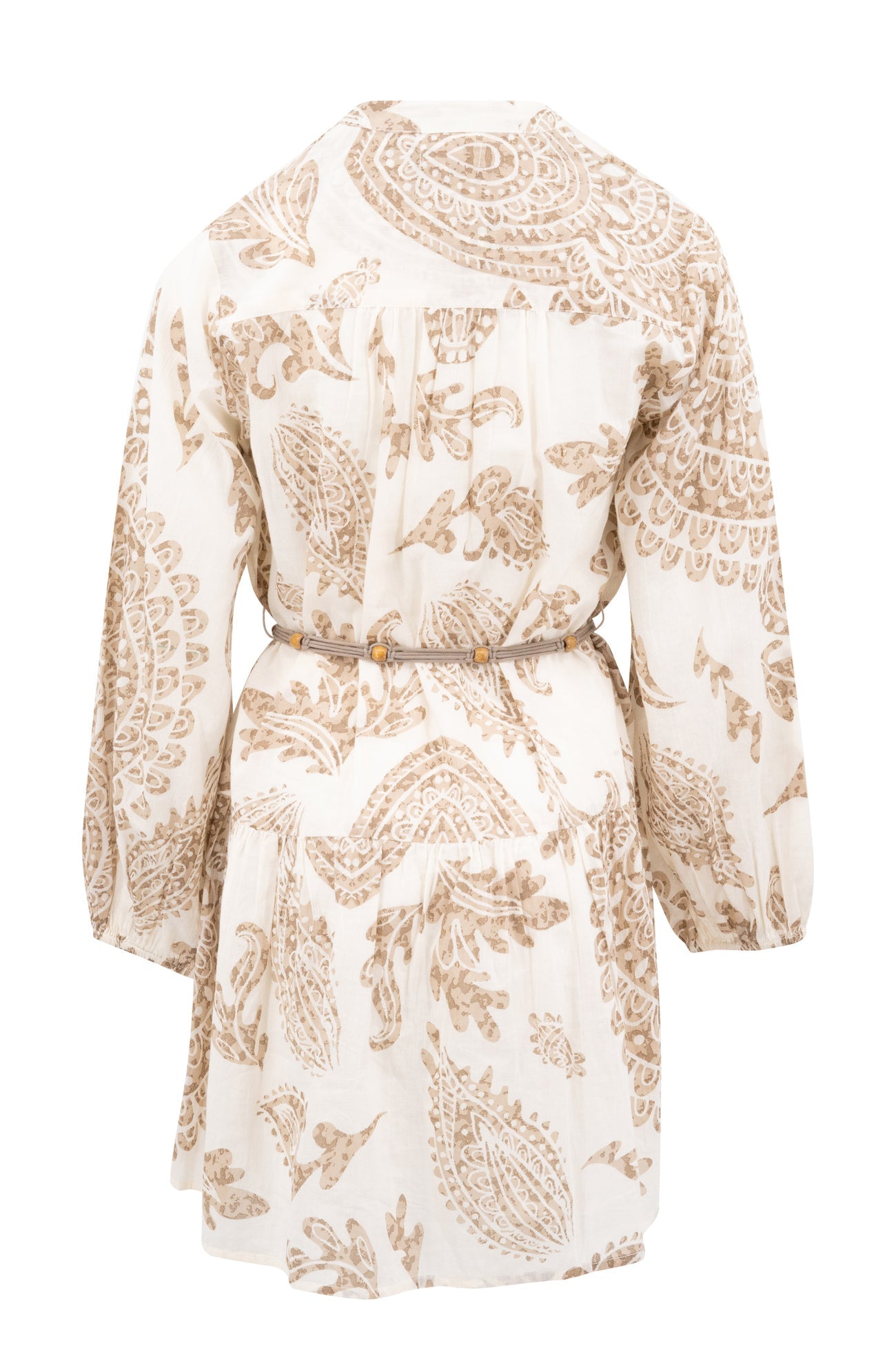 Geef jouw garderobe een update met de Short Dress Adella Taupe, ontworpen voor zonnige dagen. Heeft een V-hals, bezet met een mandala bloemen print, openstaand kraagje, sluit met een knoopsluiti Gemaakt van 100% katoen, licht en comfortabel voor warme dagen. Voeg deze must-have toe aan je zomergarderobe.