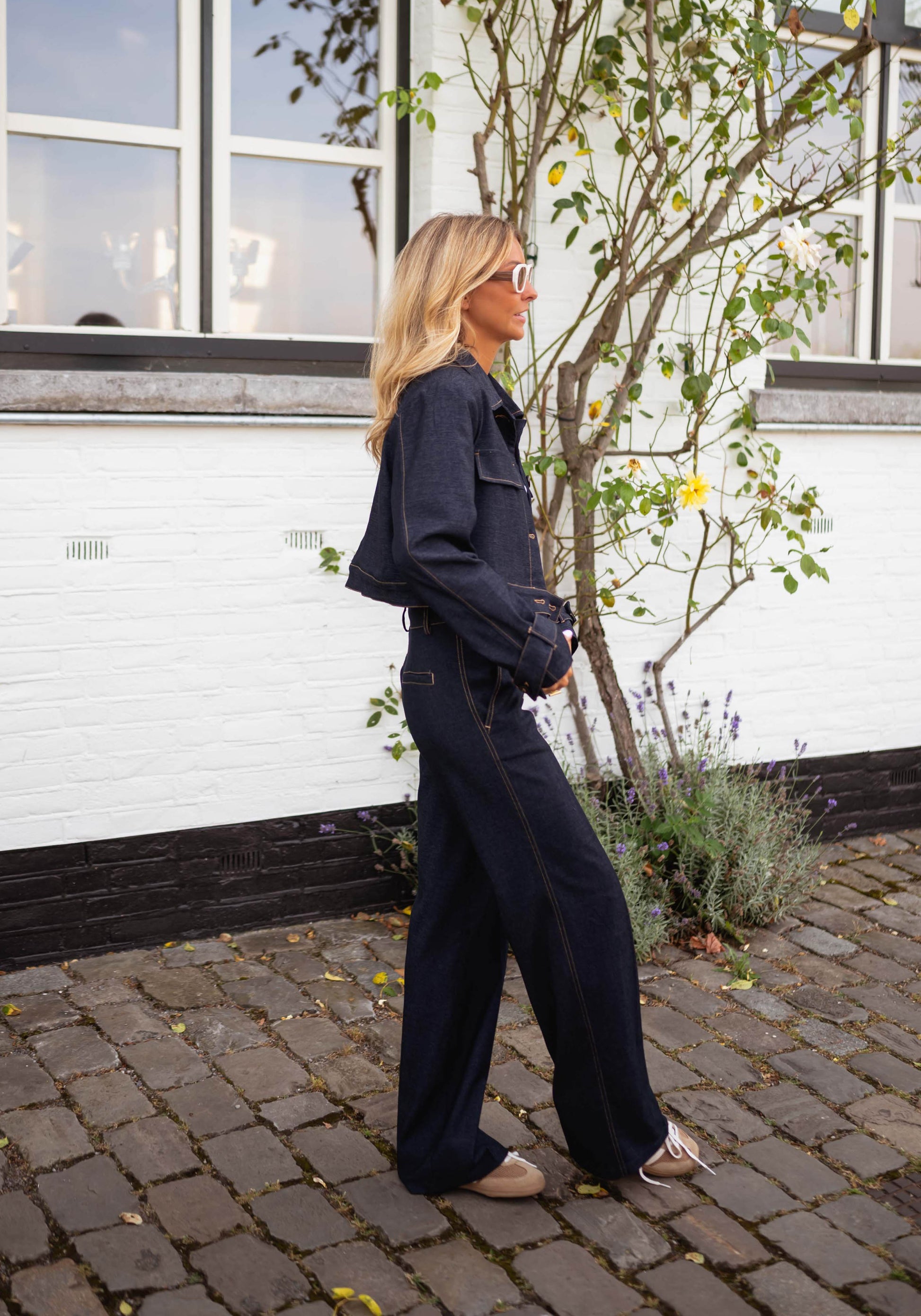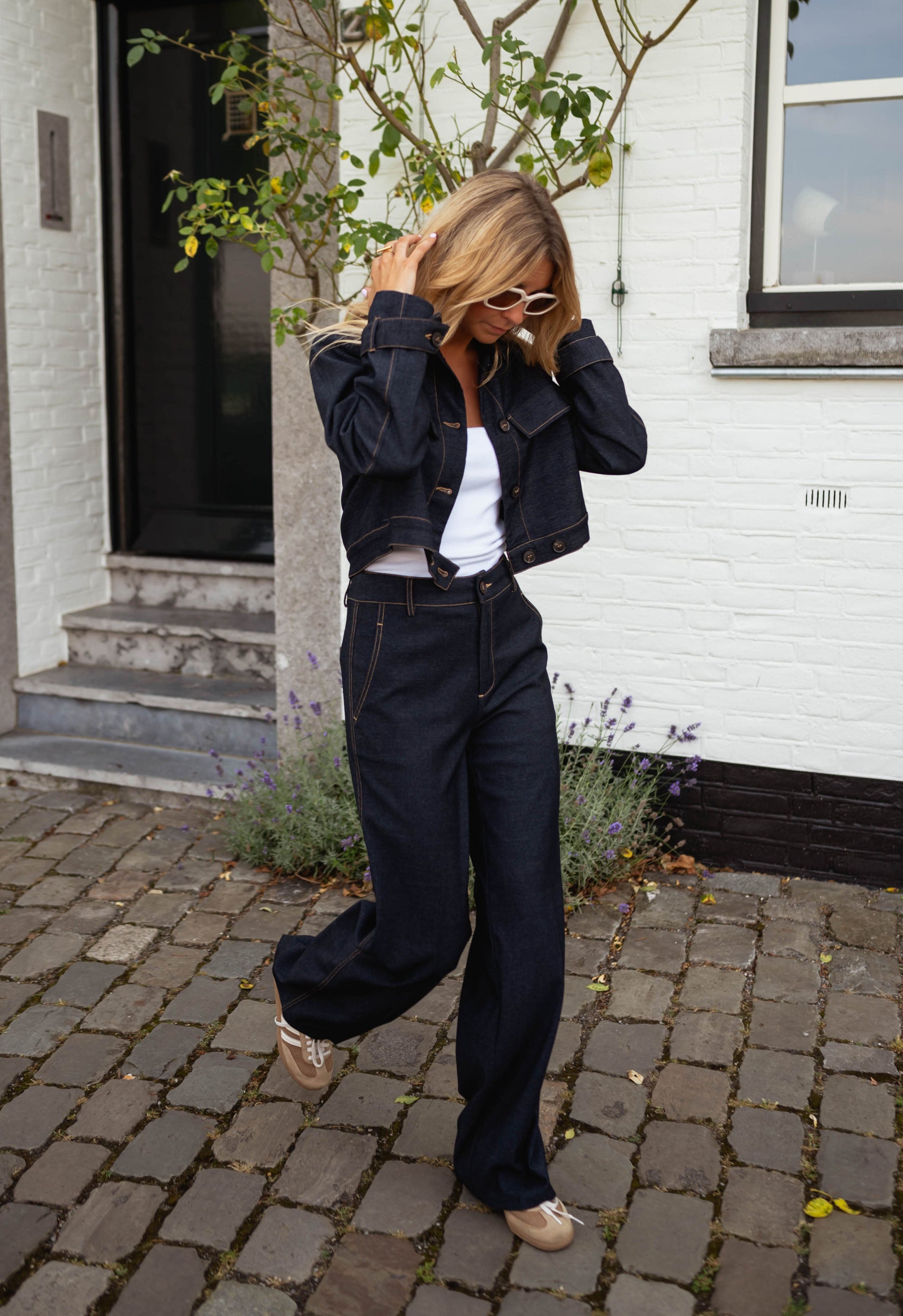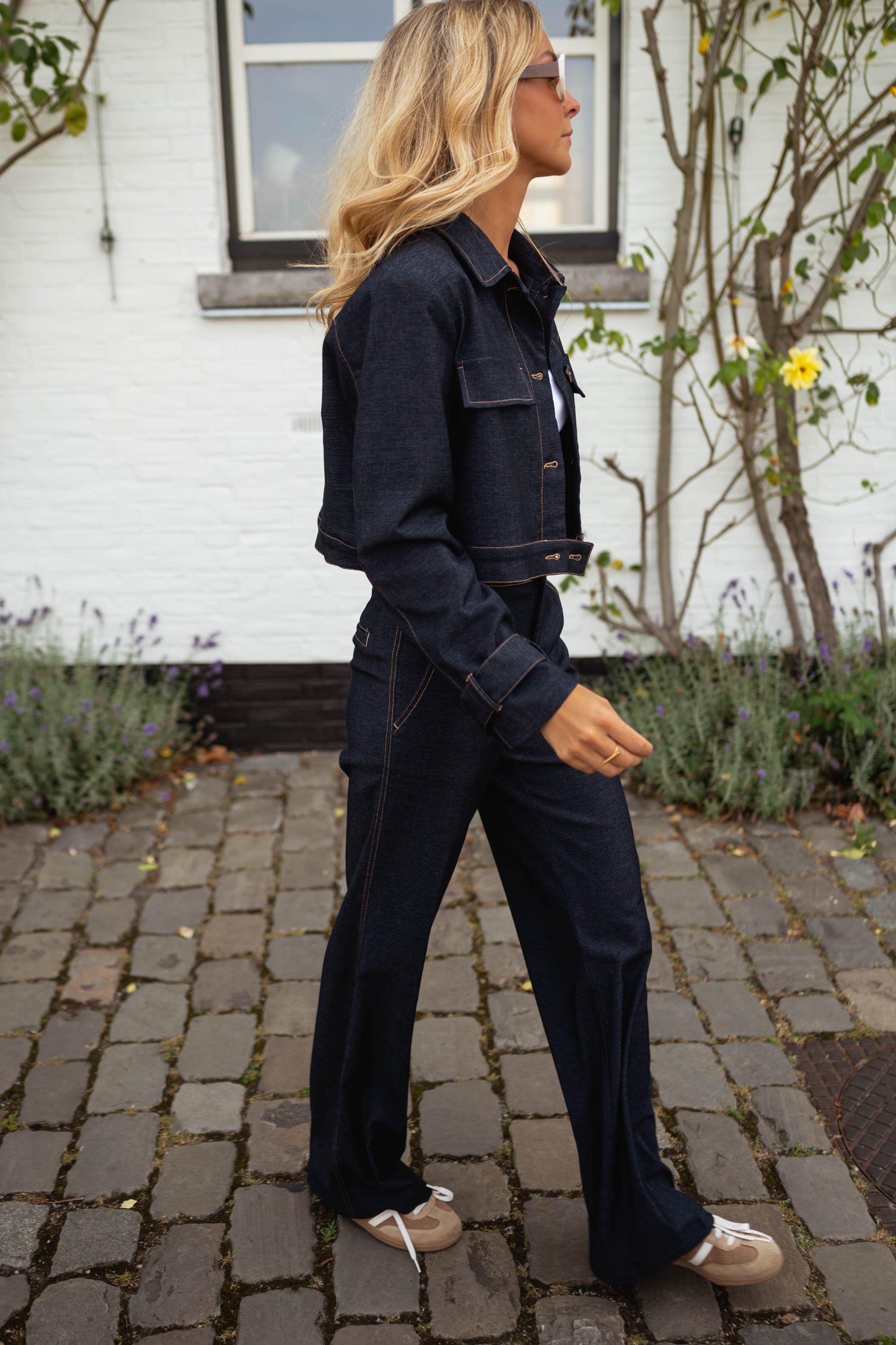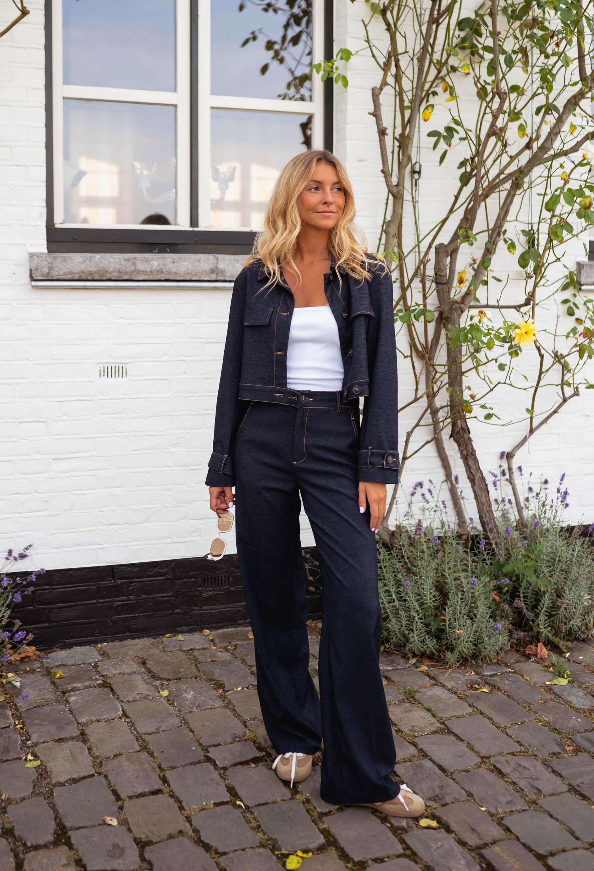 • Nos modèles portent le top Andrea blanc et le pantalon Tino bleu effet jeans
